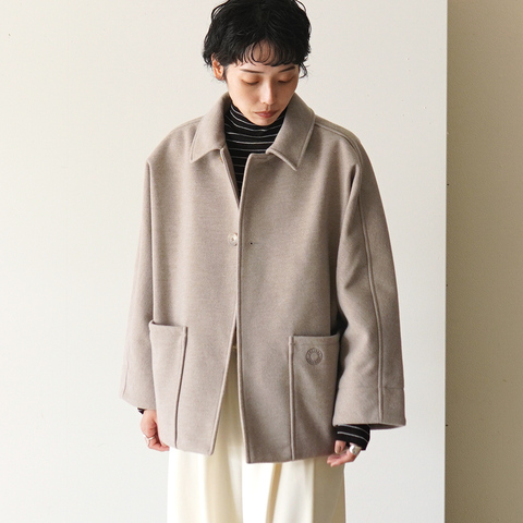 こちらはウールライクなポリエステルメルトン素材を採用した、ドルマンスリーブジャケット。ゆとりをもたせたコクーンシルエットが体のラインを自然に包み込み、リラックス感のある着心地を叶えます。