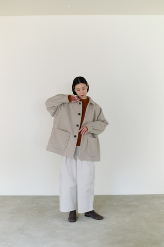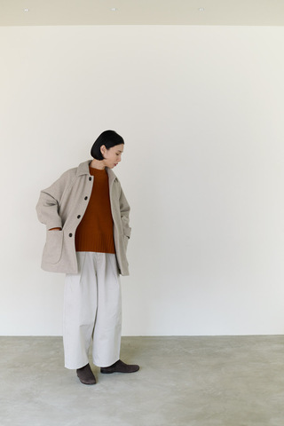 身幅やアームホールなど全体的にゆったりとしたつくりで、中に厚手のアイテムも着こめるようになっています。袖口にはタックを2本入れ、ほんのり膨らむシルエットに。