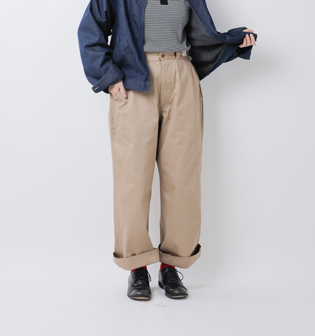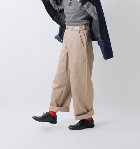 上質なコットンチノ素材を使用したワークパンツ。股上には動きやすいガゼットを採用し、アメリカの老舗ファスナーブランドのファスナーを使用するなど、細部にまでこだわったワークディテールが魅力です。ゆったりとしたワイドシルエットで、リラックスした穿き心地を実現。カジュアルからワークスタイルまで幅広く活躍する一枚です。
