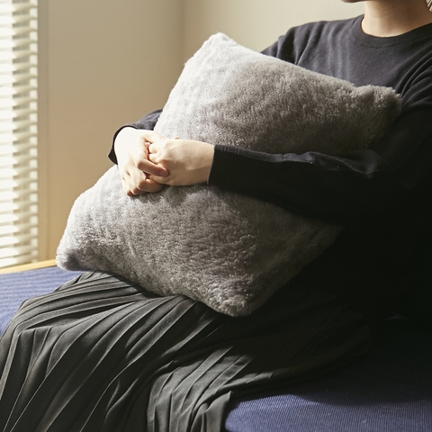 肌触りの優しいメリノウールと、ニューマイヤー製法で実現したふわふわ、もこもこの触感は感動もの。さらに湯たんぽの優しいぬくもりが加わり、ふれるだけで幸せな気持ちになれるクッションです。