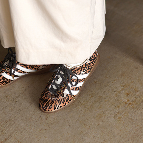 アッパーにあしらわれたレオパード柄がエネルギッシュな印象を放ち、シンプルな装いにモードな個性を添えます。スエード×レザーの異素材コンビが上質な風合いを生み、履くたびに足元から洗練された印象に。