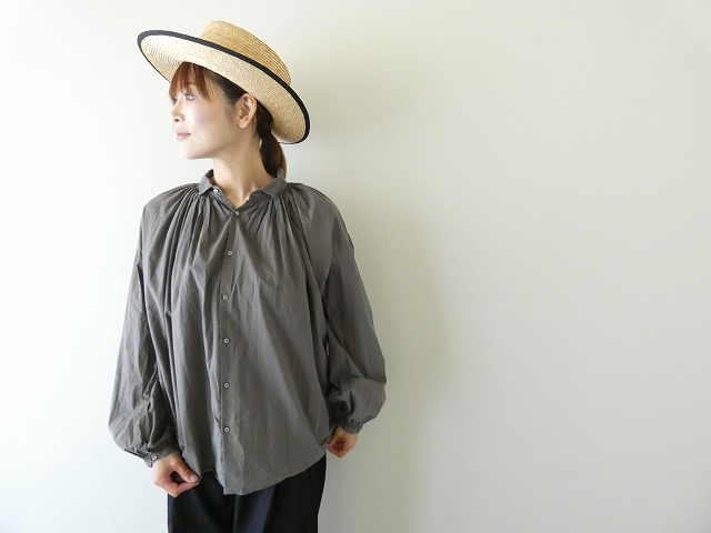 衿ぐりと袖口にギャザーをたっぷりと寄せ、繊細なギャザーが作る空気を含んだ様なふんわりとしたシルエットが美しいアンティークブラウス。身幅が広く、肩のラインが落ちた優しい着心地も魅力的です。サイドのスリットもさりげないアクセントになっております。