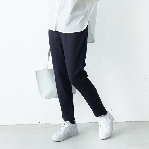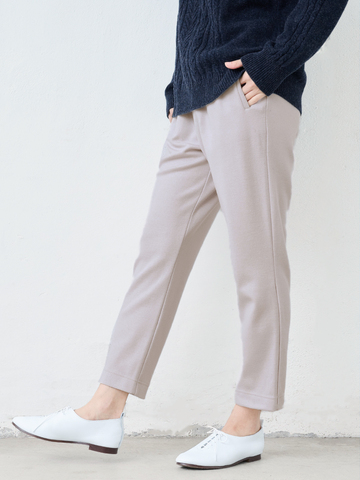 しっかり肉厚で上品な光沢の尾州産圧縮ウールを使っていて、驚くほどラクな履き心地。動きやすくて美しい、国産仕立ての上質パンツです。