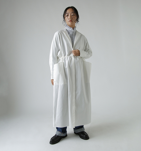美しくつややかな表情の綿100%生地を使用しています。さらりとした手触りがありながら程よくハリ感があるため、しっかりとシルエットを表現してくれます。生地は程よい厚さで、春・秋・冬に着られる生地感です。