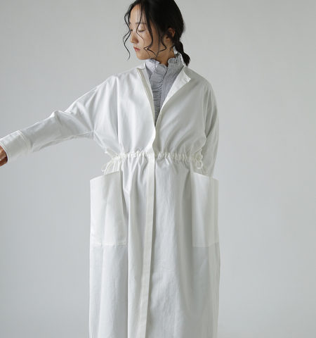 フロントを開けて、レイヤードスタイルもオススメ。ワンピースの下にスカートやトラウザーを合わせて着こなしに変化を付けられます。