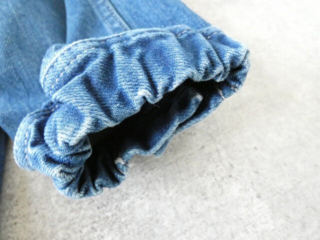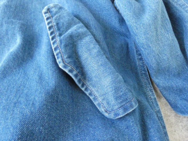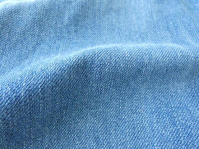 デニムの産地である広島県の福山市で織られた 11.8 オンスのデニム素材です。たて糸には超長綿の一つであるスーピマコットンを混ぜた甘撚り糸を使用。ピュアインディゴを用い、糸の中心が白く残るロープ染色をしているためアタリが出て経年変化を味わうことができます。