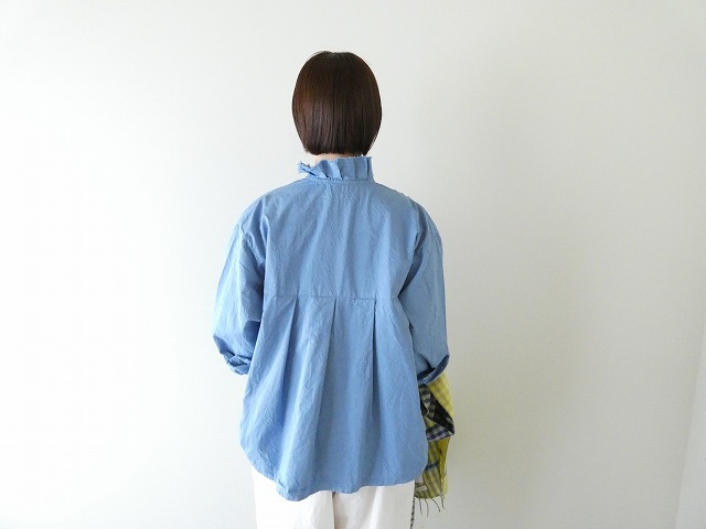 タックフリルを寄せたスタンドカラーが特徴的なブラウス。身頃にも随所にタックやギャザーが寄せられ、ふんわりとした A ラインのシルエットになっています。