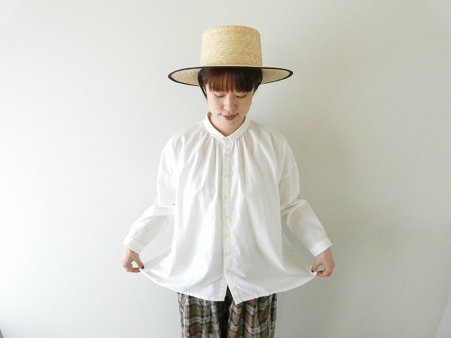 織姫炊きの生地にちび衿と襟元から入ったギャザー、ゆったりしたデザインで着回ししやすい少し長めのシャツです。袖口も少しふわっとしています。