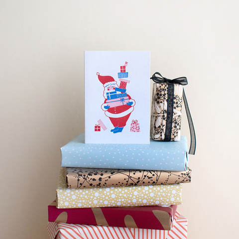プレゼントを抱えてにっこり微笑むサンタさんのパターンは、イギリスのデザイナーARIANA MARTINによるもの。ハガキよりひと回り小さなサイズの二折カードと封筒がセットになっており、記入面は空白です。