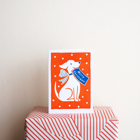 おめかししたワンちゃんのパターンは、イギリスのデザイナーARIANA MARTINによるもの。ハガキよりひと回り小さなサイズの二折カードと封筒がセットになっており、記入面は空白です。