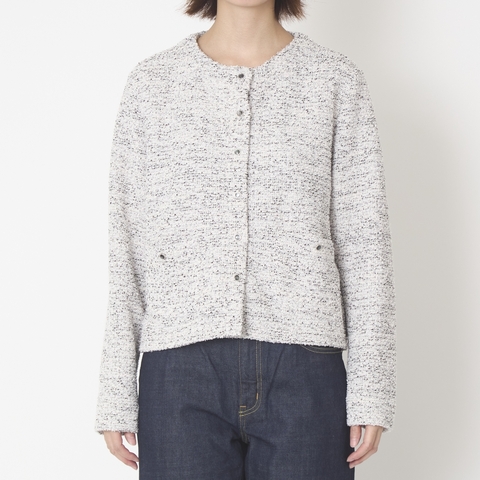 名前の通り、ツイードのような表情のニット素材を使用し、伸縮性がありストレスフリーな着心地ながら、ジャケットのようなきちんと感も備えた羽織りに仕上がっています。