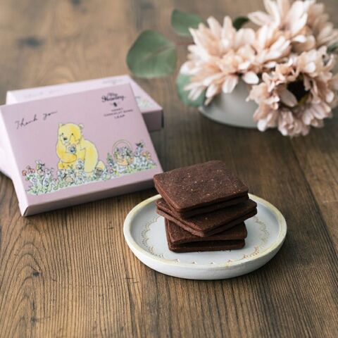 かわいらしいベビーピンクの箱には、一筆書きデザイナーが手がけた、お花に囲まれたくまさんのイラストと「thank you」の文字をあしらいました。