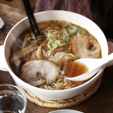 ガスコンロの火にかけ、ラーメンを作ったらそのまま食卓へ。陶器のうつわは蓄熱性に優れているので、熱々のラーメンを楽しむことができます。