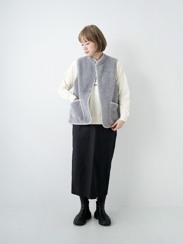 ベストは袖がないので着られる期間が短い?と一見そんな印象のアイテム。確かに、しっかりアウターが手放せない時期には出番が減りますが、シャツ+ボアベスト、スウェット+ボアベスト、ニット+ボアベストなど組み合わせで意外と長い期間着回せるアイテムです。腕まわりがあいている分、変に暑くなったりせず、体温の変化、空調の変化に対応しやすいです。アウターの準備は欠かせないからなんとなく後回しになってしまいそうなアイテムですが、一度側に置いておくとその便利さを体感し、日常での相棒になります。お家作業が多い方にもおすすめです。