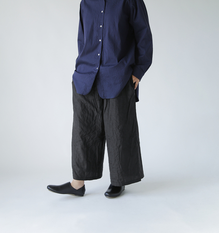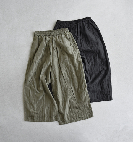 ウエスト総ゴム仕様&股上が深く、リラックスして穿けるワイドなサイズ感です。体のラインを拾わず、屈んだときも突っ張り感なく、イージーな穿き心地です。