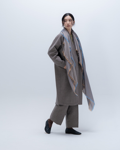 色づき始めた山の木々や日の色によって変化する街の景色、鳥から見た里山、ぼんやりと心の中に残る愛おしい風景をモザイクのようにぼんやりと表現しています。 そんな景色とともに感じる、ウールのマフラーはこれからの肌寒くなる季節にそっと首元に優しさとあたたかさを感じることのできるアイテム。