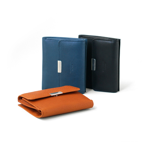 日本最高品質のレザーを製造する“栃木レザー”を贅沢に使用した、お財布と小物のシリーズ。こちらはフラップ部分のシルバー金具と、スクエアフォルムがクールな印象の二つ折り財布です。