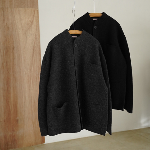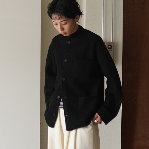 日常に自然と馴染む、上品なニットジャケット。カーディガンのような軽やかさを持ちながら、きちんと見えする構築的なフォルムが魅力です。