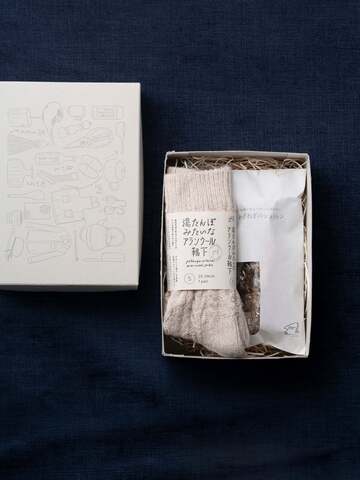 履いた時に一番驚くのが、その暖かさ。まるで湯たんぽを履いているように足元がポカポカします。高級ウール糸を贅沢に使った暖かい自慢の靴下です。アランをモチーフに手編み感のあるホールガーメントならではの靴下となりました。この暖かさを贈り物に。