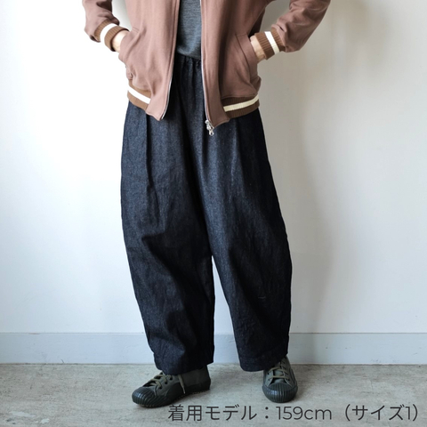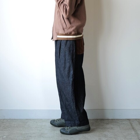ジャケットと同じく、綿75%・麻25%のコットンリネンデニムを使用。しっかりとした質感の中に柔らかさがあり、肌に心地よく馴染みます。履き込むほどに風合いが深まり、自分らしい一本へと育っていきます。