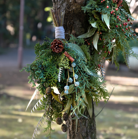 仕上げに松笠やシナモンなど表情豊かなオーナメントを飾り付け、クリスマスを演出します。