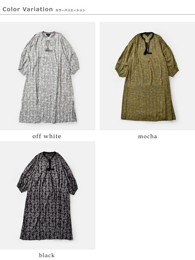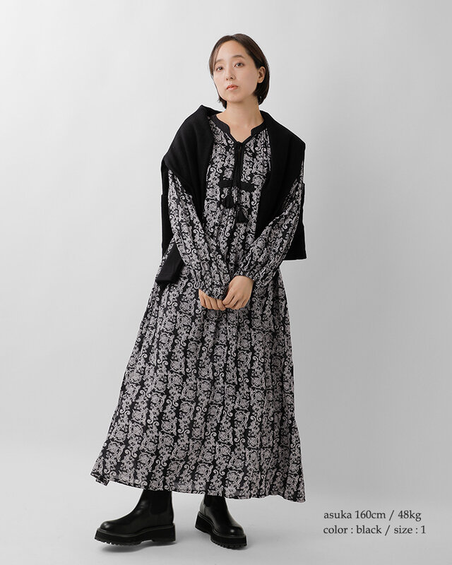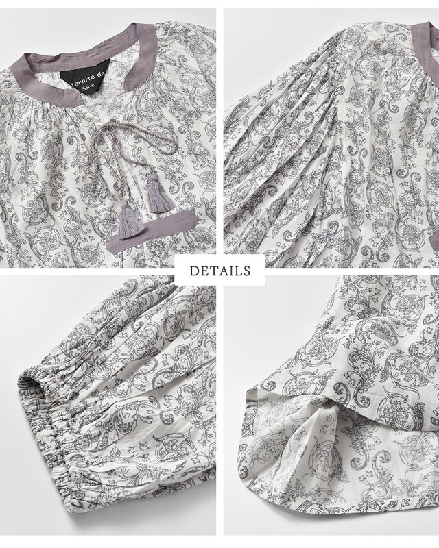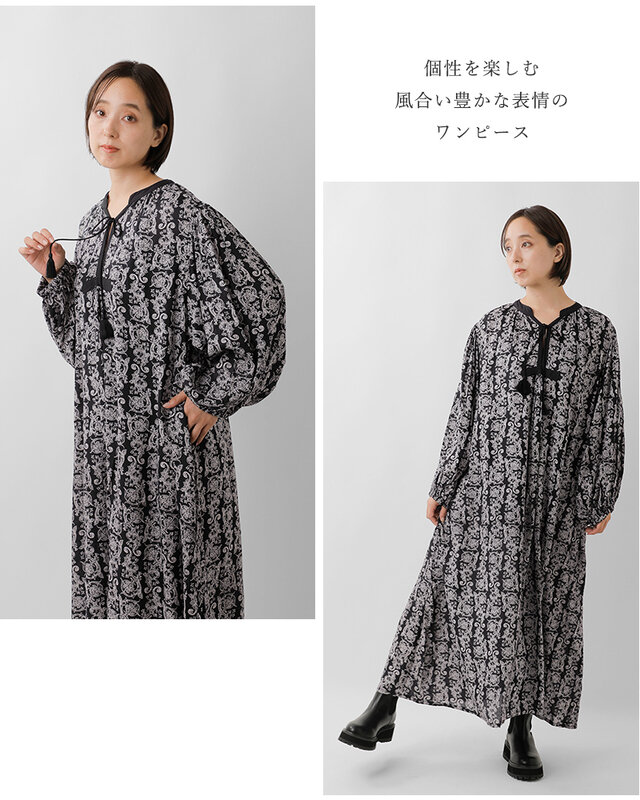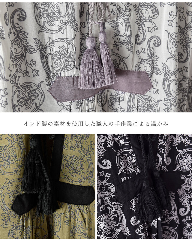 ・部分的な無地の生地がアクセントに。V開きのネックにフリンジ付きの紐が揺れるデザイン。