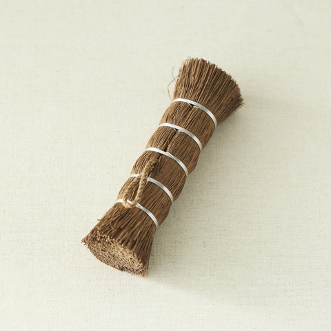 こちらは、ヤシ科の常緑高木である棕櫚(しゅろ)の幹から採れる繊維状の毛(棕櫚皮)を使用したささらです。柔らかくしなり、しっかりとしたコシもあるこの繊維を、ステンレス線を使った「綴り」と呼ばれる技法で束ねています。