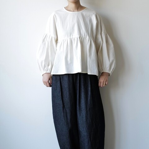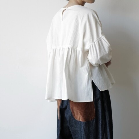 優しい肌触りと風合いが魅力の、クラフトワッシャー生地で仕立てたギャザーブラウスです。