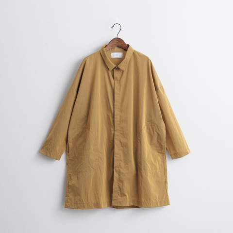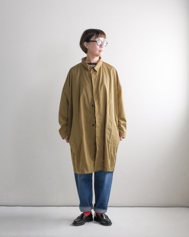 すっきりとしたステンカラー、ゆったりシルエット、ドロップショルダー、シンプルなボタン。