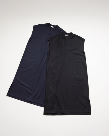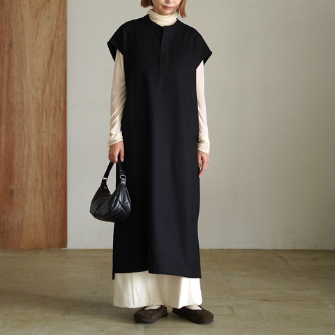 ハイカウントの梳毛ウールを使用した、上品なフランネル仕立てのオーバーシャツドレス。ストレートラインとスキッパーネックの組み合わせが、縦のラインを強調しすっきりとした印象を与えます。