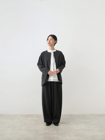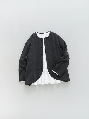 オケージョンシーンを意識して仕立てた、洗練された雰囲気のジャケット。裾に向けて緩やかにすぼまるコクーンシルエットで、身体をふわっと包みます。少し長めの着丈ですが、裾のカッティングにより軽やかな印象になっています。きちんと感がありつつ窮屈感のないサイジングが、日常着としても手に取れる理由に。特別な日もデイリーも頼りになるジャケットです。