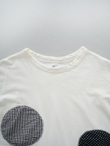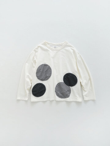 無地や柄の組み合わせが楽しいパッチワーク風のデザインです。大き目のドットが着こなしのポイントに。モノトーンやスモーキーカラーの配色が落ち着いた印象を与え、大人のコーディネートに取り入れやすくなっています。