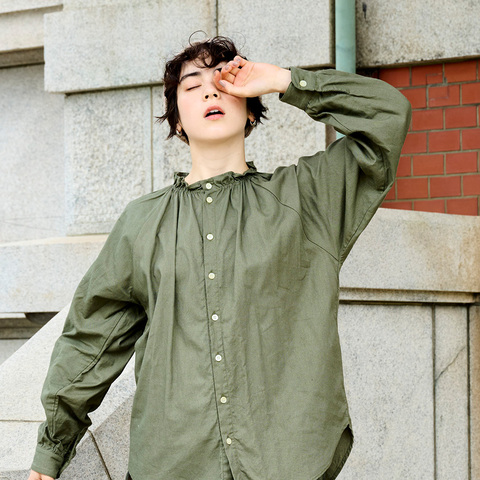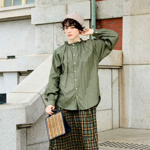 季節を問わず使える素材感も魅力のひとつです。春は一枚で、秋冬はニットやベストのインナーとして。軽やかな生地感で重ね着もしやすく、長く活躍します。