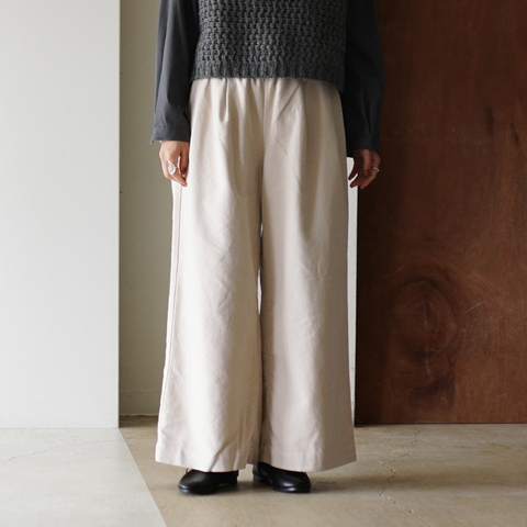 ゆとりあるワイドシルエットながらも、タックを入れることで立体感が生まれ、すっきりとした印象に仕上げています。ウエストは総ゴム仕様で締め付けが少なく、ドローストリングで自在にフィット感を調整可能。