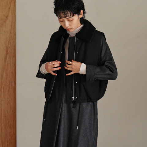 軽やかで上品な印象をもたらすショートジレ。襟元にはウール混のプードルファーをあしらい、顔まわりを優しく包み込みます。