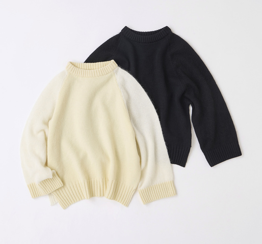 前身頃・袖口・裾・首周りはフレンチメリノウール糸を使用して、後身頃と袖はベビーアルパカ混の糸で編み立てたセーターです。