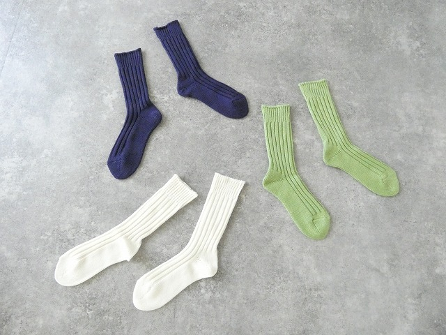シンプルなかたちのコットンウールリブソックス。ふんわりとしていて程よく厚みがあり、履き心地の良いソックスです。清潔感のあるオフ白、爽やかなグリーン、さりげなく差し色に使えるパープル。どの色もそれぞれ素敵です。