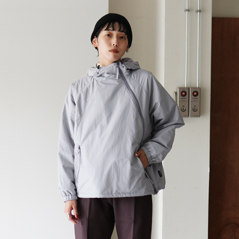 立体的なシワ加工を施したナイロンシェルに、斜めに走るジップラインが印象的なフーデットジャケット。フロントのスナップボタンが開けたときのシルエットを美しく保ち、動きの中でもスタイルをキープします。