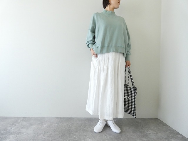 程よい肉感で秋口早い時期から取り入れられるオールシーズンな素材です。少しフェード感があるのでカラーものも取り入れやすいと思います。モックネックで短い丈、脇を前に振った動きのある形です。袖や背中にもハギが入り振りミシンがポイントになっています。
