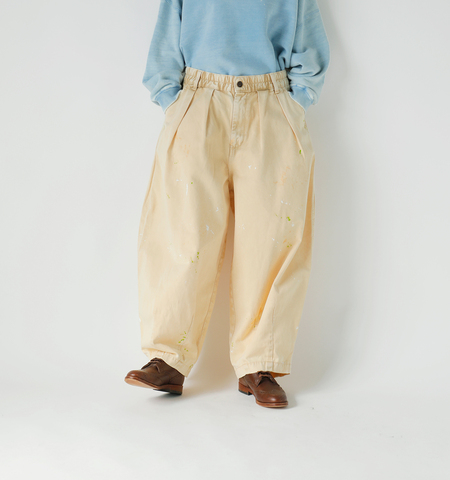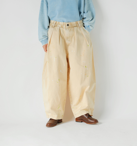 tsuzuli(ツヅリ)より、コットンチノリメイクサーカスパンツHARVESTYのサーカスパンツのハードリメイク。フロントにタックを、スソにダーツを施し、大胆なボリュームシルエットに仕上げた ”サーカスパンツ”。生地は粗野感のある綿チノ素材。ペンキがランダムに飛び散ったような激しめのリメイク加工でtsuzuliらしく再構築しました。ウエストゴムでデイリーに穿きやすく、着回しにもぴったりなアイテムです。ユニセックスデザインで、3サイズをご用意しています。