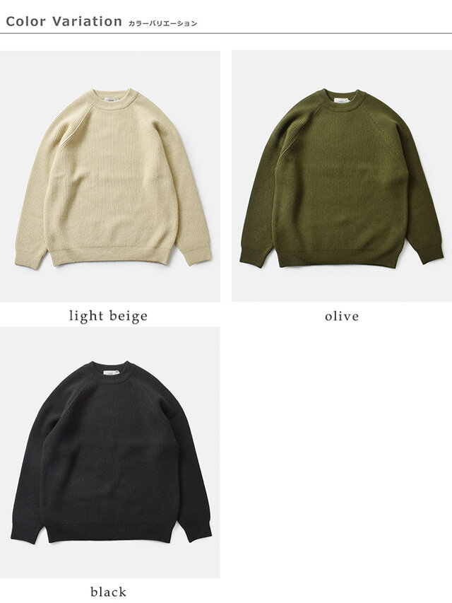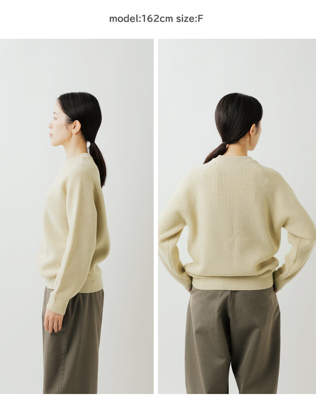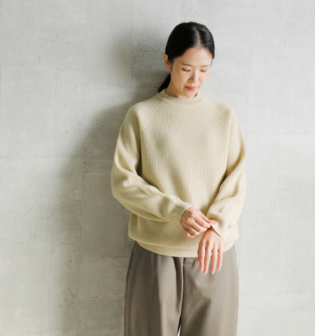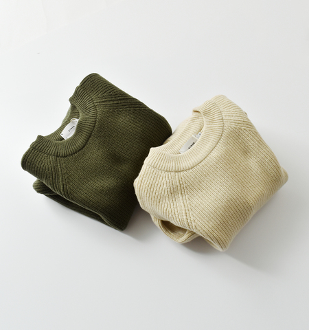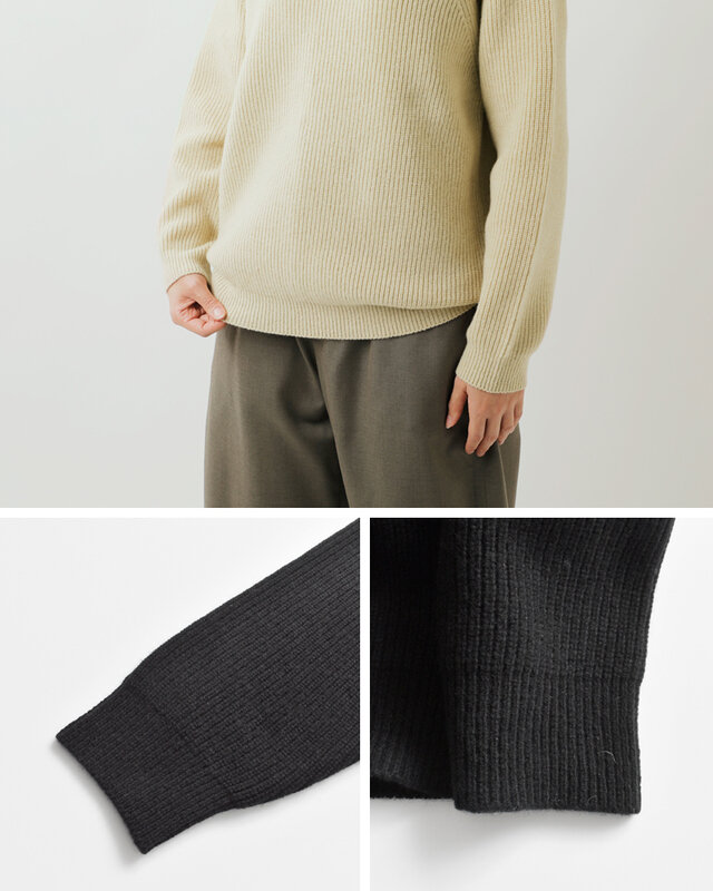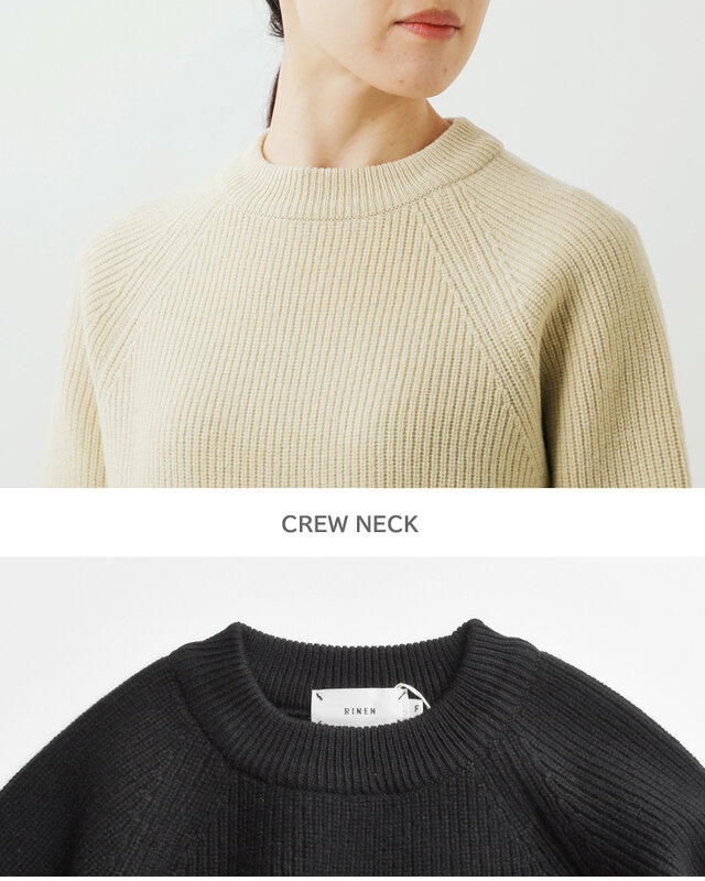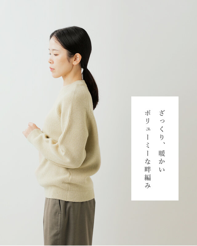 コンパクトなクルーネック。襟の縁は厚みのあるリブ編みで、立体感があります。