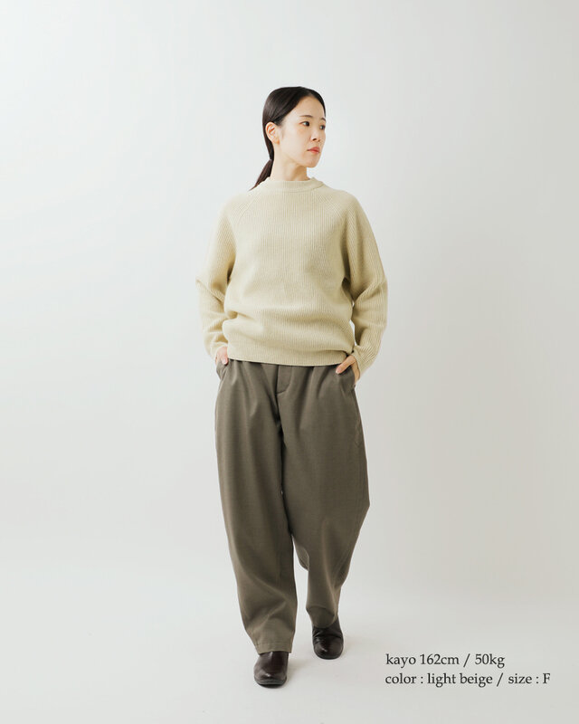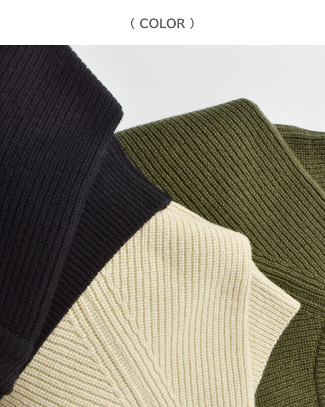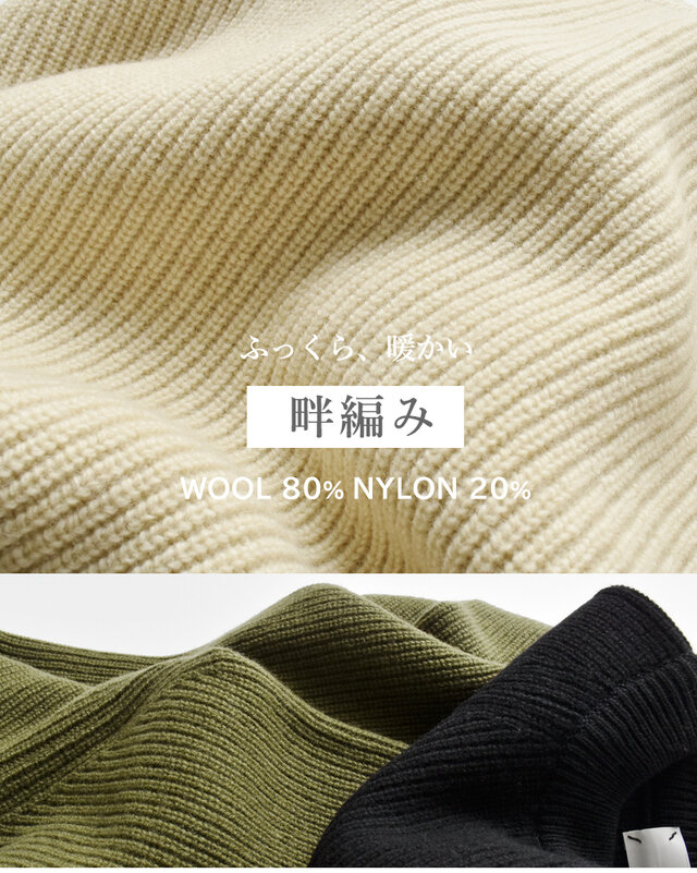 立体感のある凹凸が特徴の畔編みのニット。肉厚のニットでしっかりと空気を含むので、保温性が高く、寒い季節にぴったりです。伸縮性に優れていてウール特有のチクチク感が少なく、ソフトな肌触り。ボリュームがありますが、軽い着心地で、秋冬の普段使いに活躍してくれます。