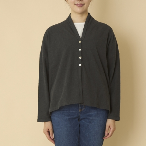 素材使いにこだわりを持つTANG.(タング)が、寒暖差の激しい季節にぴったりのカーディガンを作りました。首元までカバーする羽織りは、巻物いらず。ポコポコとしたパイル生地を使用しているので、シンプルな形ですが、どこかほかと違った雰囲気。大人の女性のために考えられたデザインは二の腕や腰回りのラインを拾わない工夫が施されています。