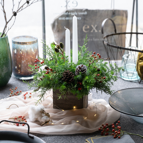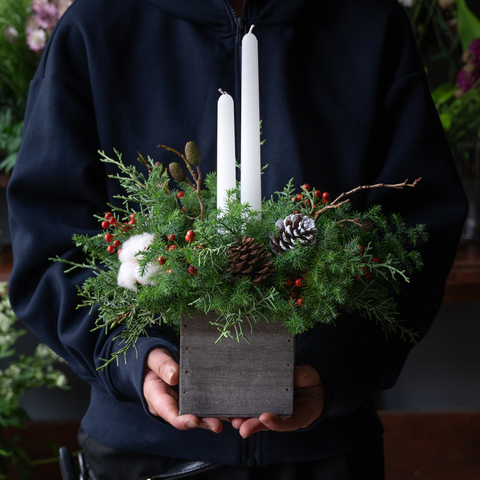 アレンジメントの真ん中でゆらゆらと揺れる、キャンドルの灯りが、穏やかにクリスマスムードを演出します。