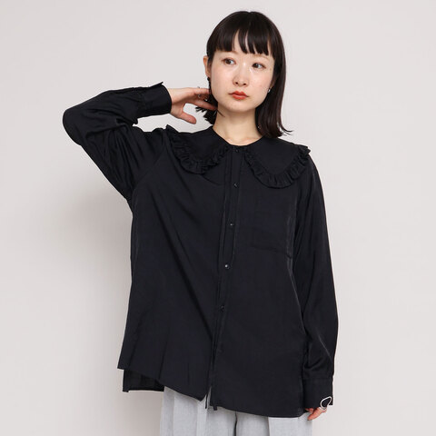 柔らかな光沢感のサテン生地を使用したフリルカラーブラウス。