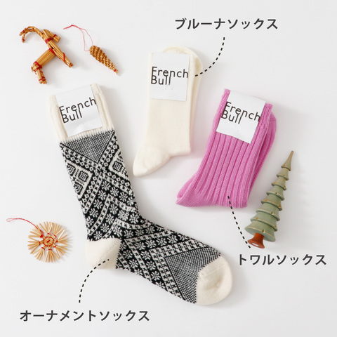 クリスマスツリーに飾るオーナメントをイメージした柄のオーナメントソックス、パンツにもスカートにも合わせやすいベーシック丈感のブルーナソックス、オーストラリアンメリノウール糸を使用したトワルソックスをまとめてギフトラッピングしました。