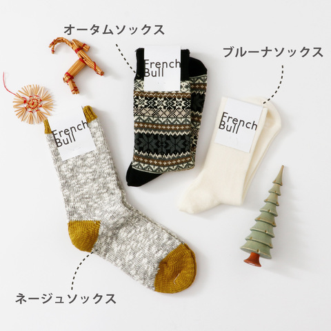 ざっくりと厚手に編み立てたカジュアルなネージュソックス、木の実や落ち葉をイメージした柄のオータムソックス、パンツにもスカートにも合わせやすいベーシック丈感のブルーナソックスをまとめてギフトラッピングしました。