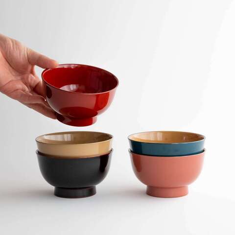 Fudanシリーズの「おとなわん」を包んでいるのは、「MRマルチロール漆」という特殊な漆。丈夫で剥がれにくいため、漆器でありながらも食洗機の使用やスタッキングが可能になっています。また光沢度の高さも特徴のひとつです。