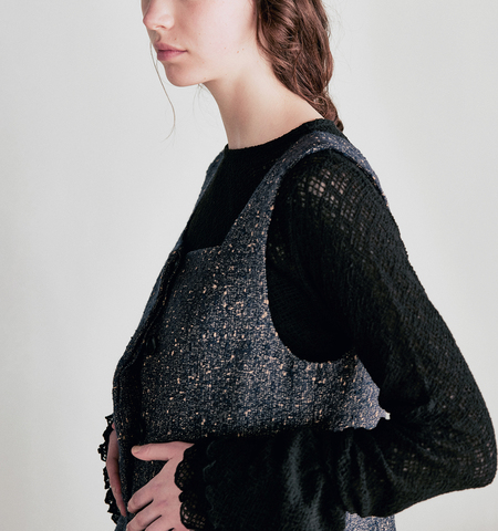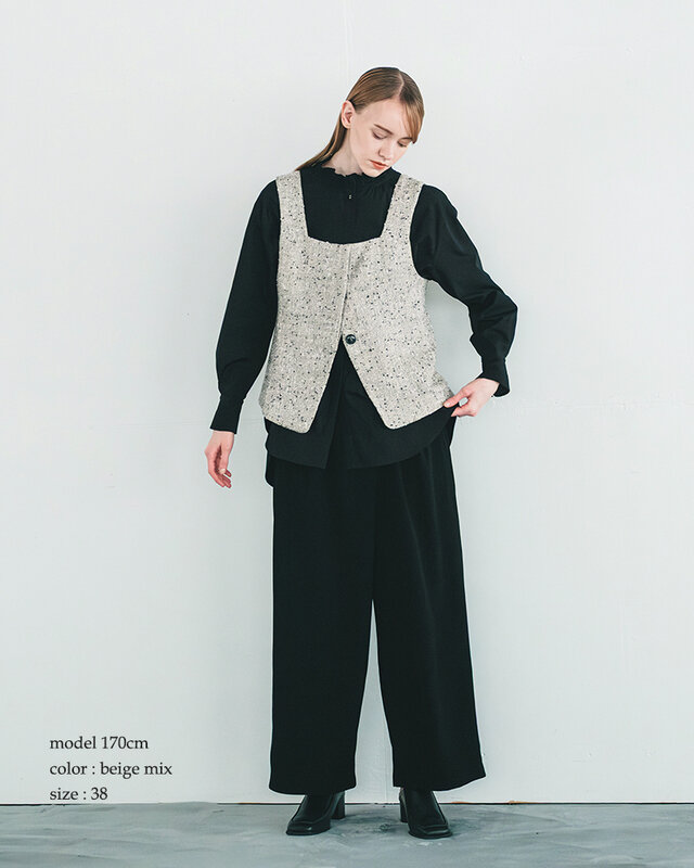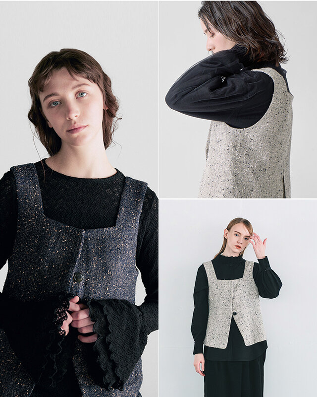 whyto(ホワイト)より、ネップ ツイード ビスチェ“nep tweed bustier”のご紹介です。素材とデザインをリニューアルさせた人気のビスチェです。下のボタンを開けて、少しルーズに着崩したりとカジュアル感も出しやすいアイテムです。立体感のあるツイード織りにネップ糸を織り込んだ存在感がある素材。ゆとりのあるサイジングなので、タイトなビスチェが苦手な方にもおすすめしたい1枚。です。同素材のパンツとセットアップでの着用もおすすめです。