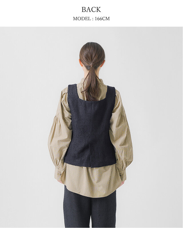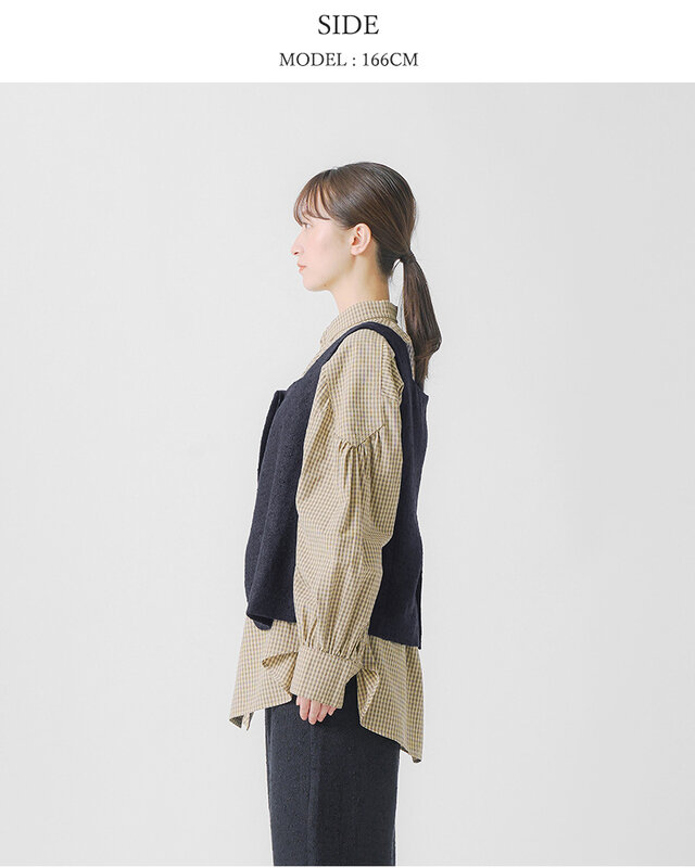 スクエアシルエットのネックライン。フロントはボタン2つ。アームホールは程よくゆとりを持たせてレイヤードしやすいデザイン。